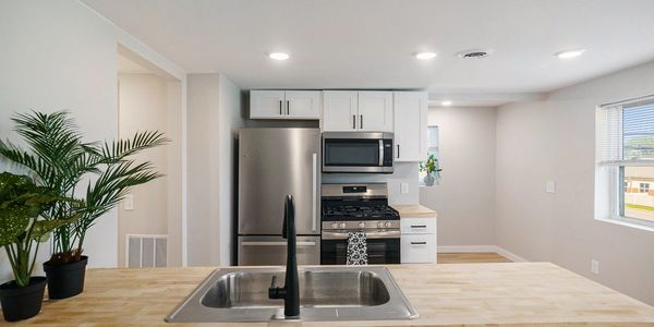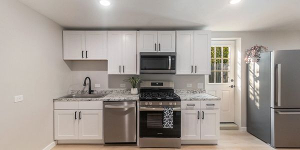 -Newly renovated kitchen with sleek stainless steel appliances, including stove, refrigerator, microwave and dishwasher, perfect for cooking and hosting.